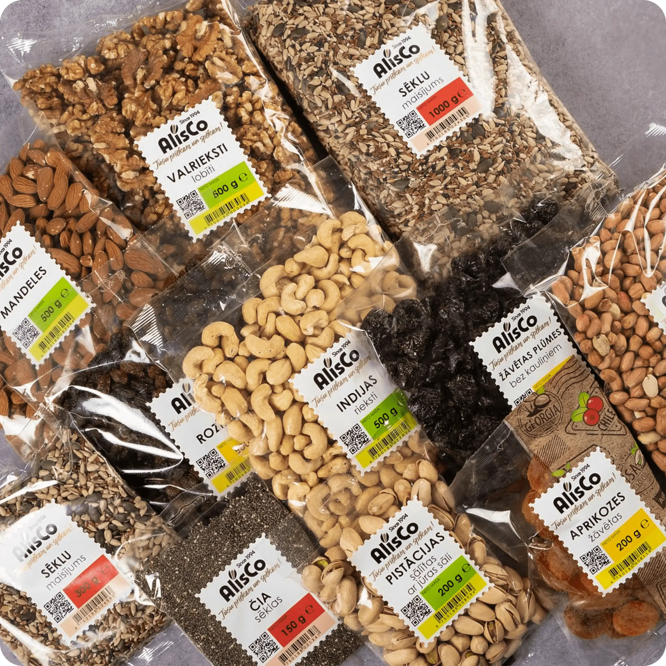 Alis Co piedāvā plašu augstas kvalitātes produktu klāstu, kas palīdz mums iegūt klientu uzticību un saglabāt vadošās pozīcijas arvien pieaugošajā tirgus konkurencē. Mēs sadarbojamies ar lielākajiem un zināmākajiem Latvijas tirdzniecības uzņēmumiem, kā arī ar maizes un konditorejas nozares ražotājiem, kas nodrošina lielus apjomus un iespēju iepirkt riekstus un žāvētus augļus no pasaules lielākajiem piegādātājiem par saprātīgām cenām.